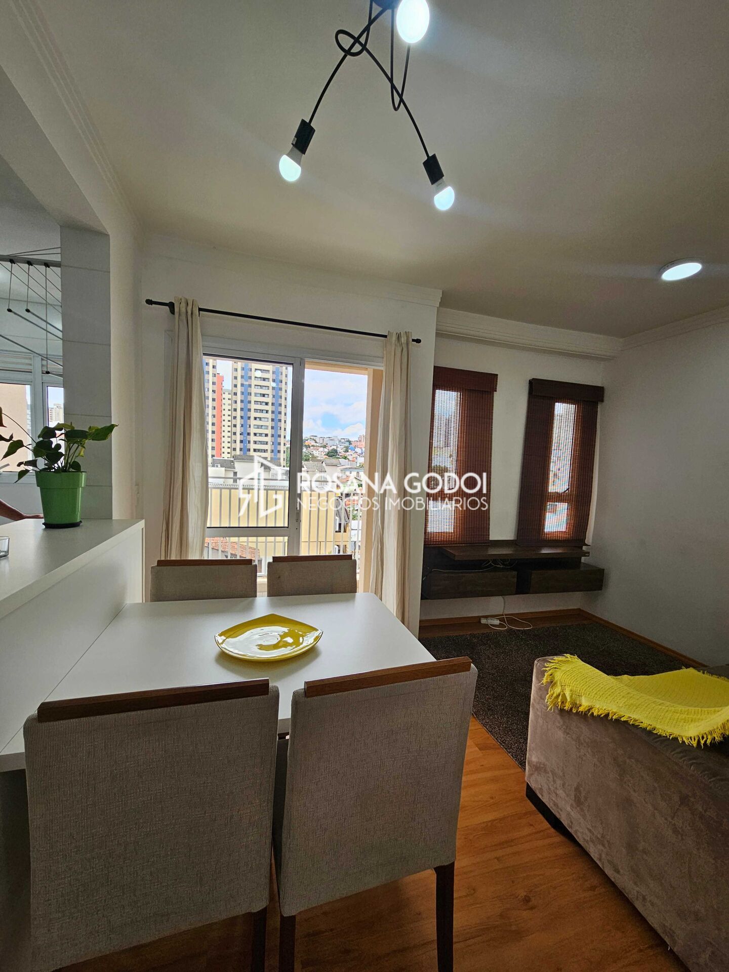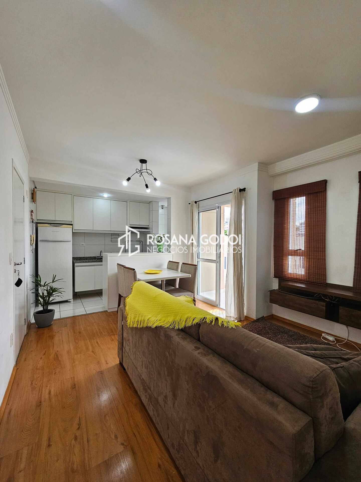 Possui dois dormitórios com sacada sendo um com armários e cama, sala para dois ambientes com sacada (ficam sofá, painel e mesa de jantar), cozinha estilo americano com armários planejados (ficam micro-ondas, geladeira e fogão), área de serviços com armários, banheiro social e 2 vagas de garagem fixas.