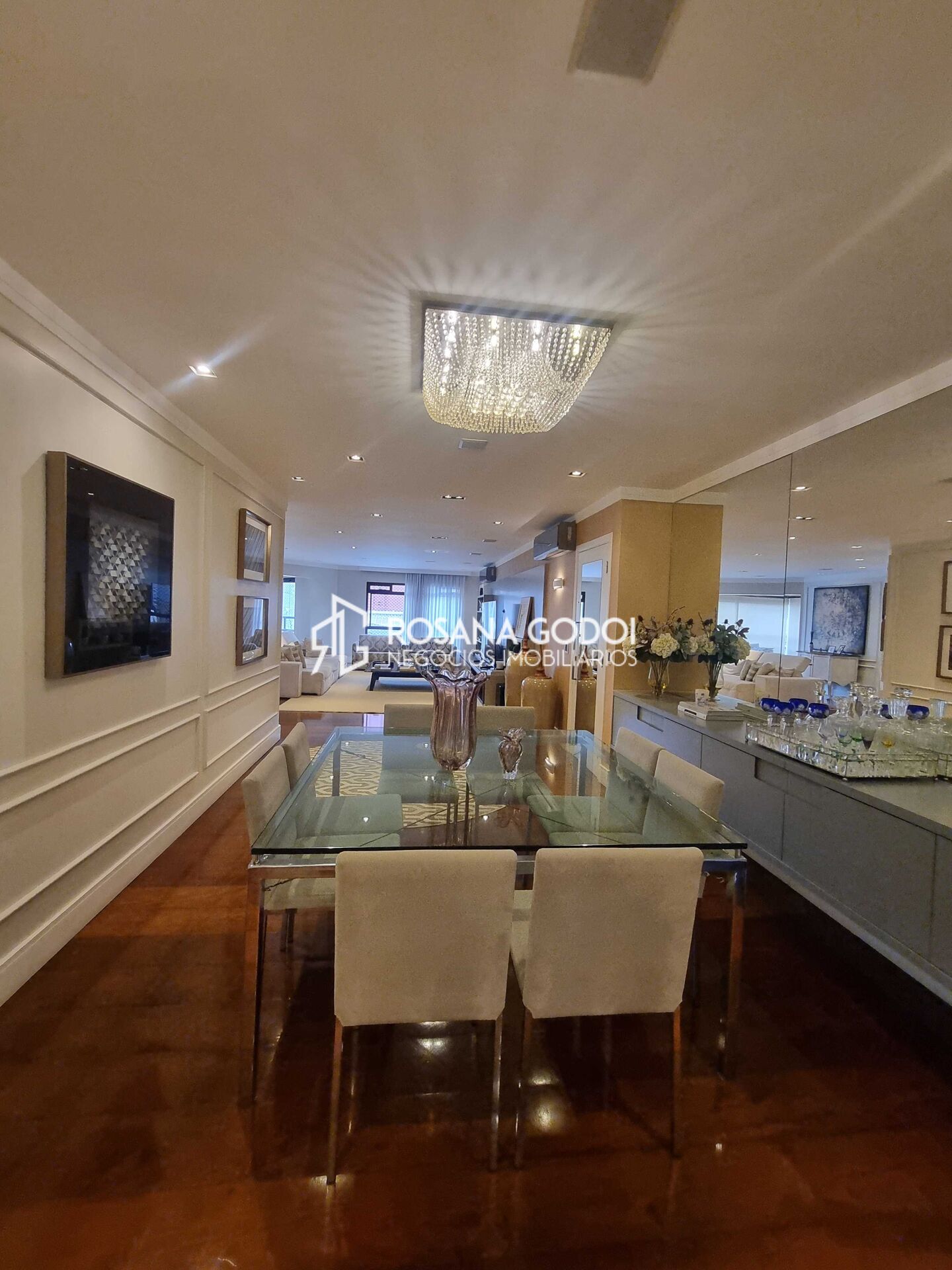 São 4 dormitórios com armários, sendo 1 suíte com varanda, Sala para 3 ambientes com sacada integrada, Cozinha ampla, Área de serviços com lavabo, Wc social, Lavabo, Depósito e 3 Vagas de garagem cobertas e fixas.